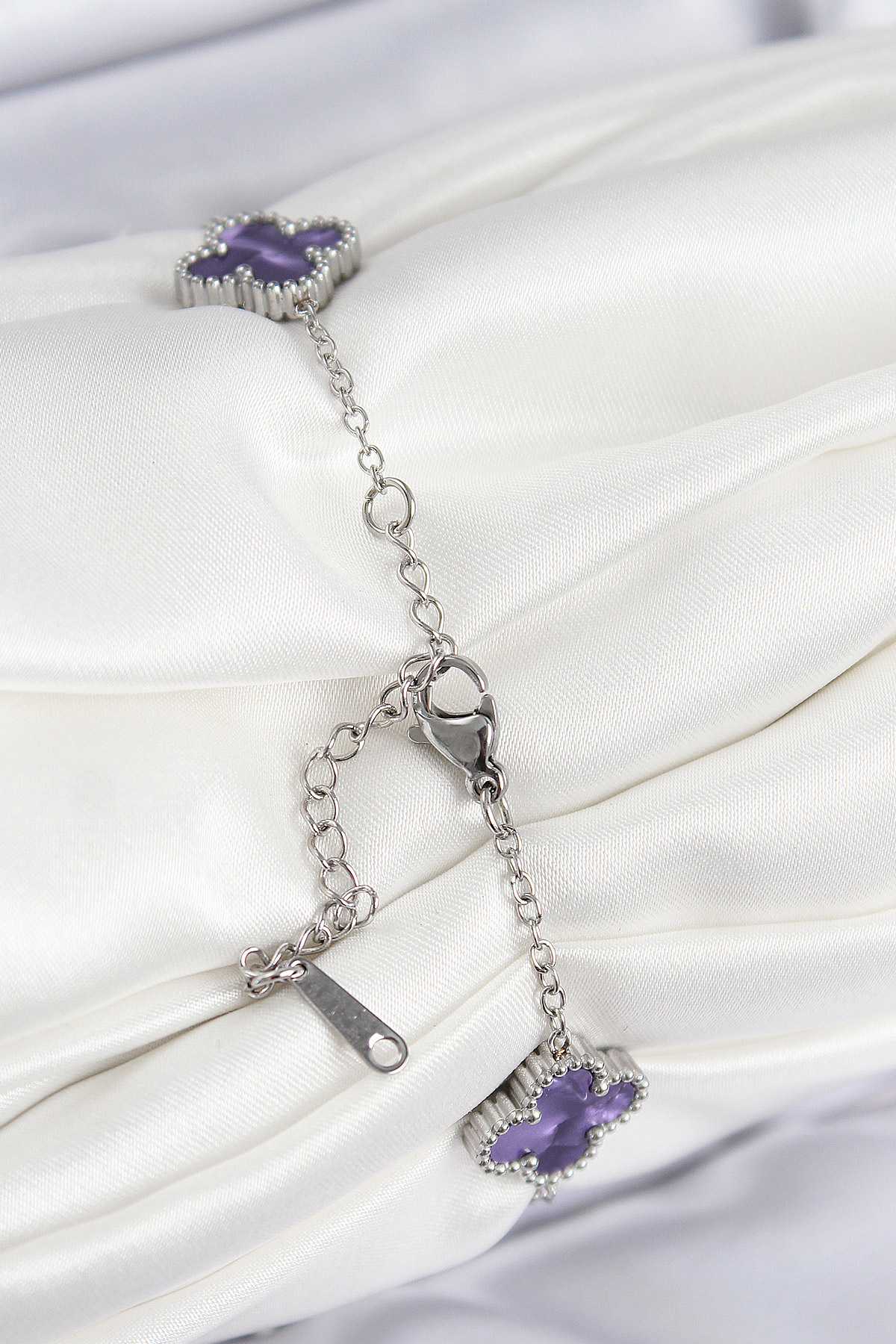 316L Çelik Sedefli Mor Gümüş Renk Yonca Kadın Bileklik