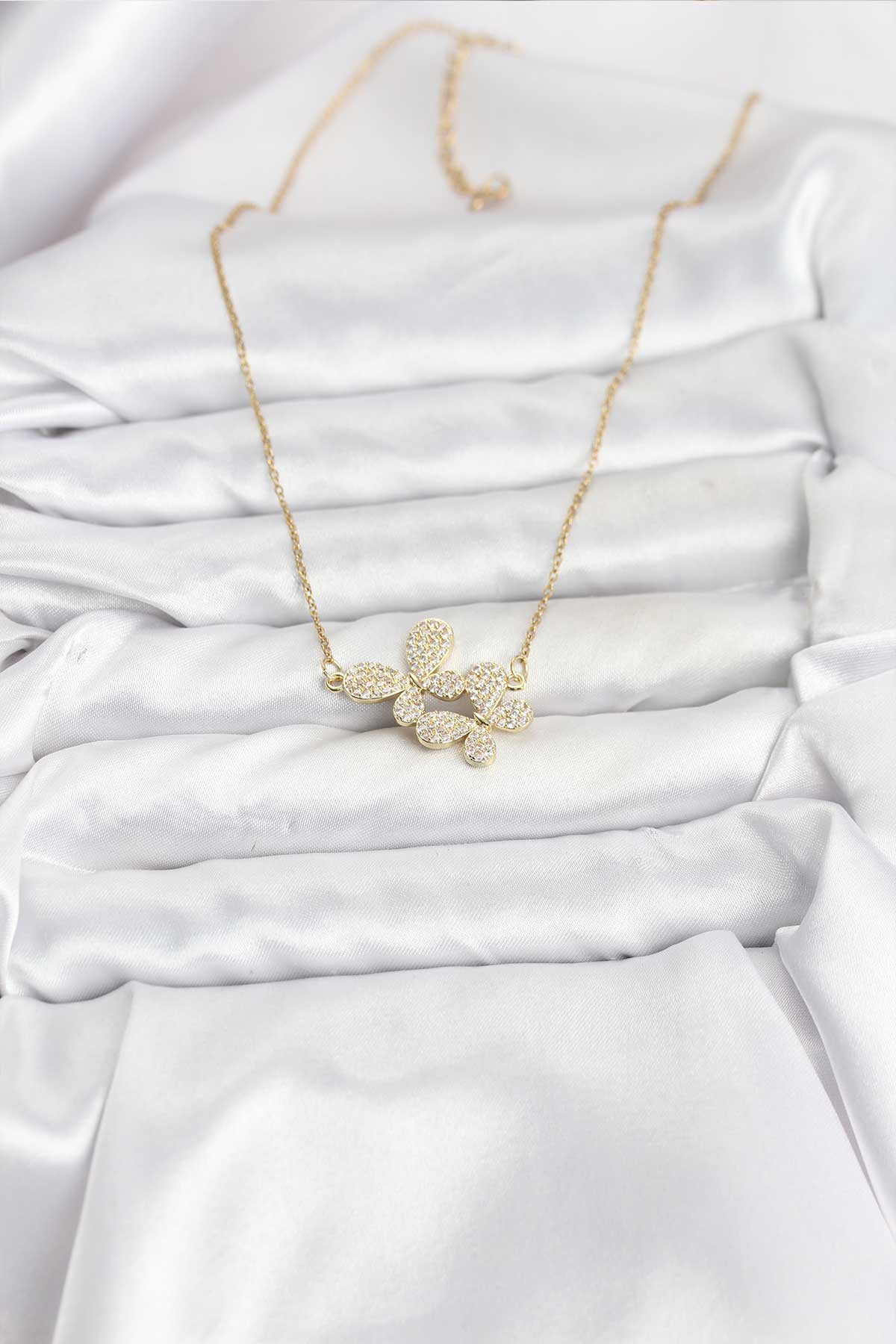 316L Çelik Zincir Gold Renk Zirkon Taşlı Kelebek Model Kadın Kolye