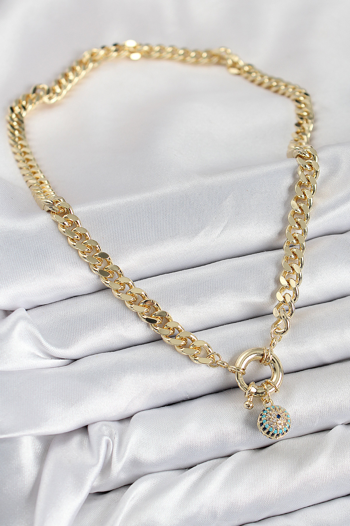 Pirinç Zirkon Taşlı Nazar Boncuk Detaylı Klasik Zincir Model Gold Renk Kadın Kolye
